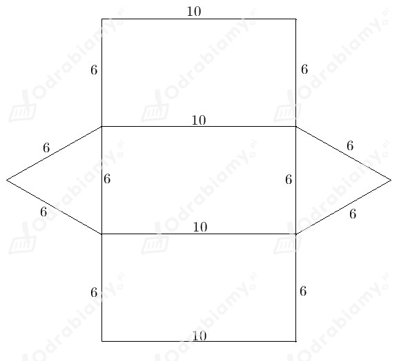 Podstawą graniastosłupa jest trójkąt równoboczny o boku 6. Wysokość graniastosłupa ma długość 10.
