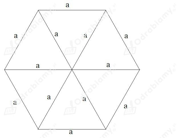 Każdy sześciokąt foremny o boku a można podzielić na 6 jednakowych trójkątów równobocznych o boku a: