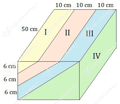 Pierwsza część to graniastosłup o podstawie w kształcie trójkąta prostokątnego (przyprostokątne mają długość 6 cm i 10 cm) oraz wysokości 50 cm.